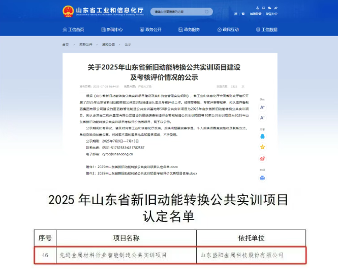 近日,山東省工業(yè)和信息化廳公示了《2025年山東省新舊動能轉換公共實訓項目認定名單》,山東盛陽金屬科技以“先進金屬材料行業(yè)智能制造公共實訓項目”成功入選。